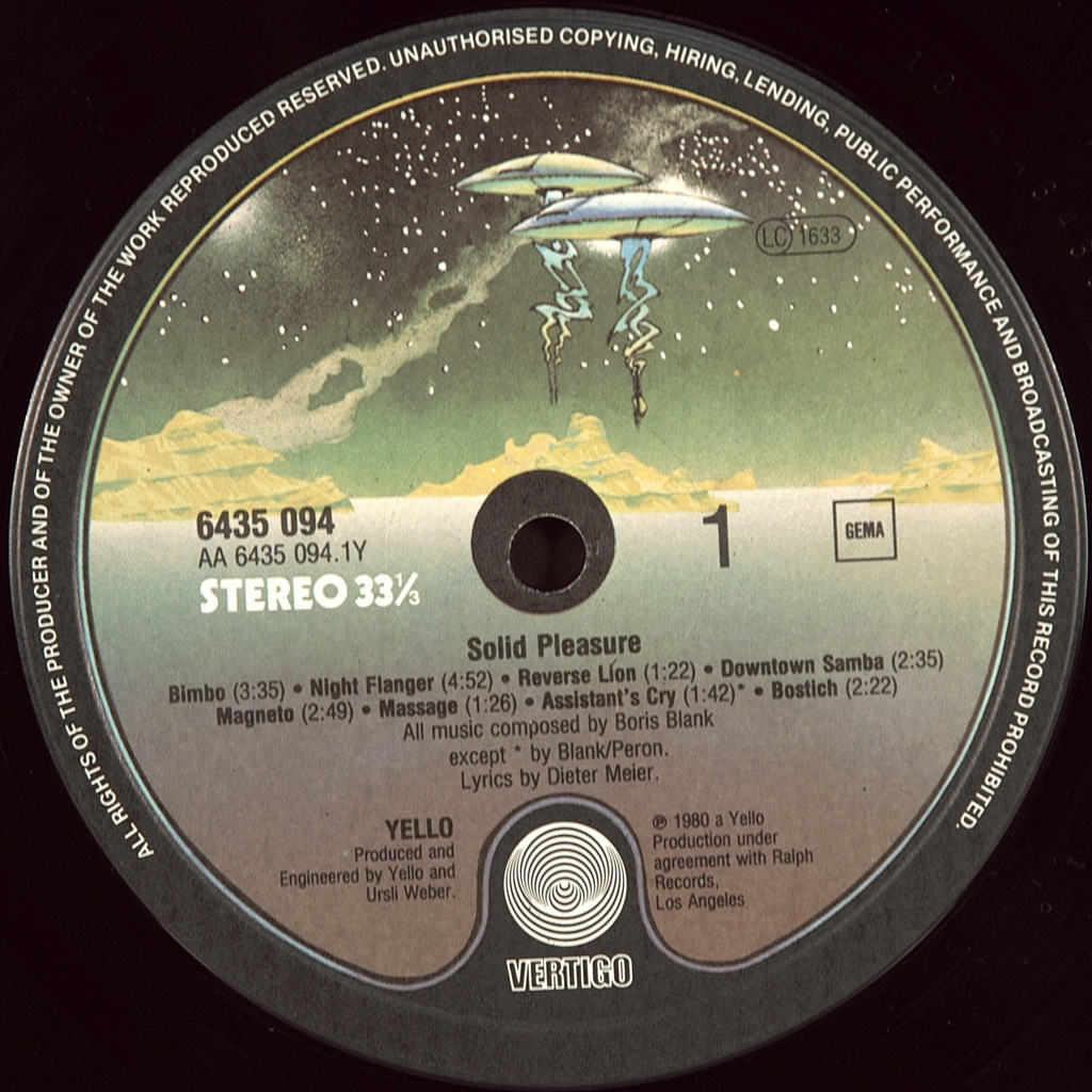 YELLO-SOLID PLEASURE-1980-FIRST PRESS GERMANY-VERTIGO -6435094. The rare original Solid Pleasure is the debut album by the Swiss duo Yello . Solid Pleasure was released in 1980. All critics praised Allmusic - 4 stars, Gueardian - 5 stars, Mojo- 4 stars, and the track Bostic took 23rd place in the American charts.