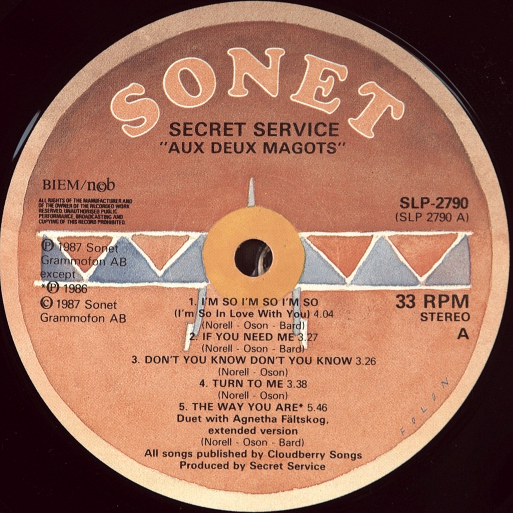 SECRET SERVICE-AUX DEUX MAGOTS-1987-FIRST PRESS SWEDEN-SONET-SLP-2790. A very rare Swedish original of the cult group. The last album of the band that went gold in Sweden.