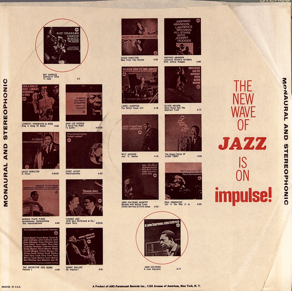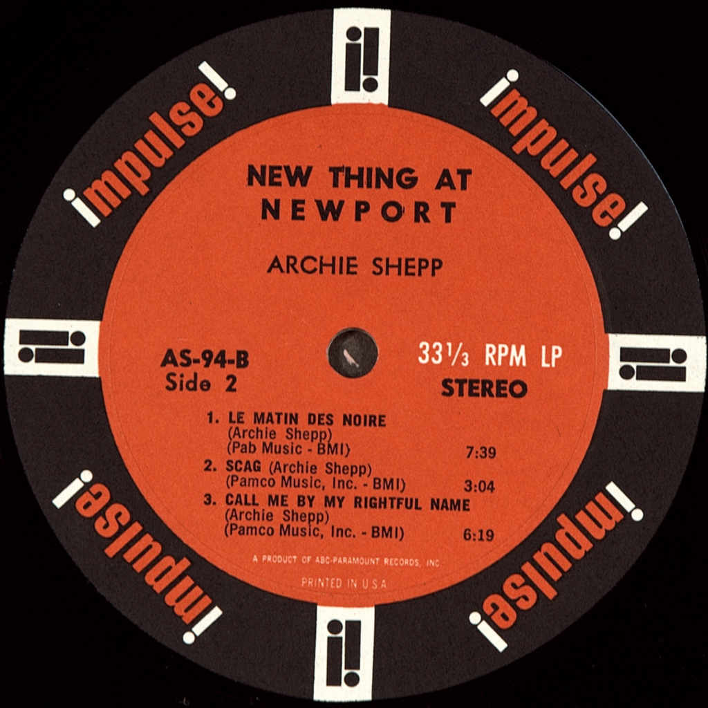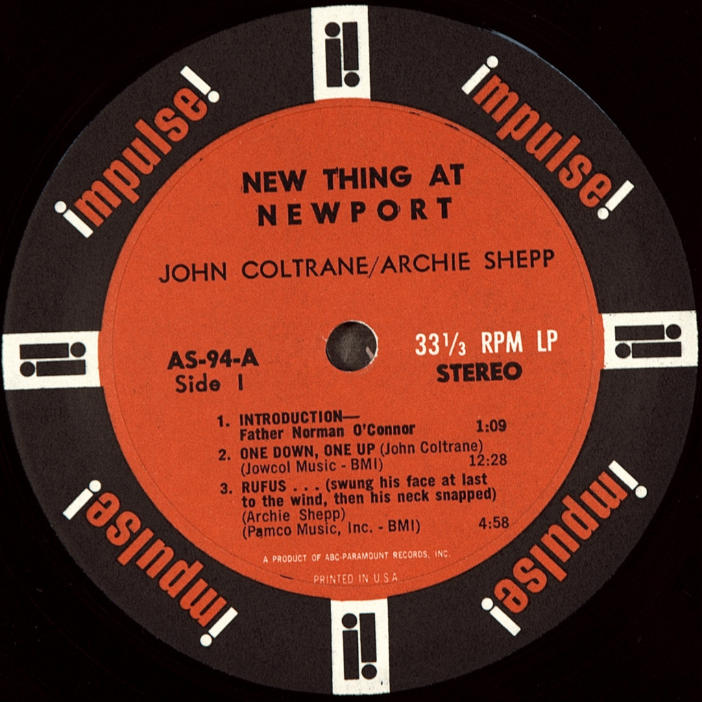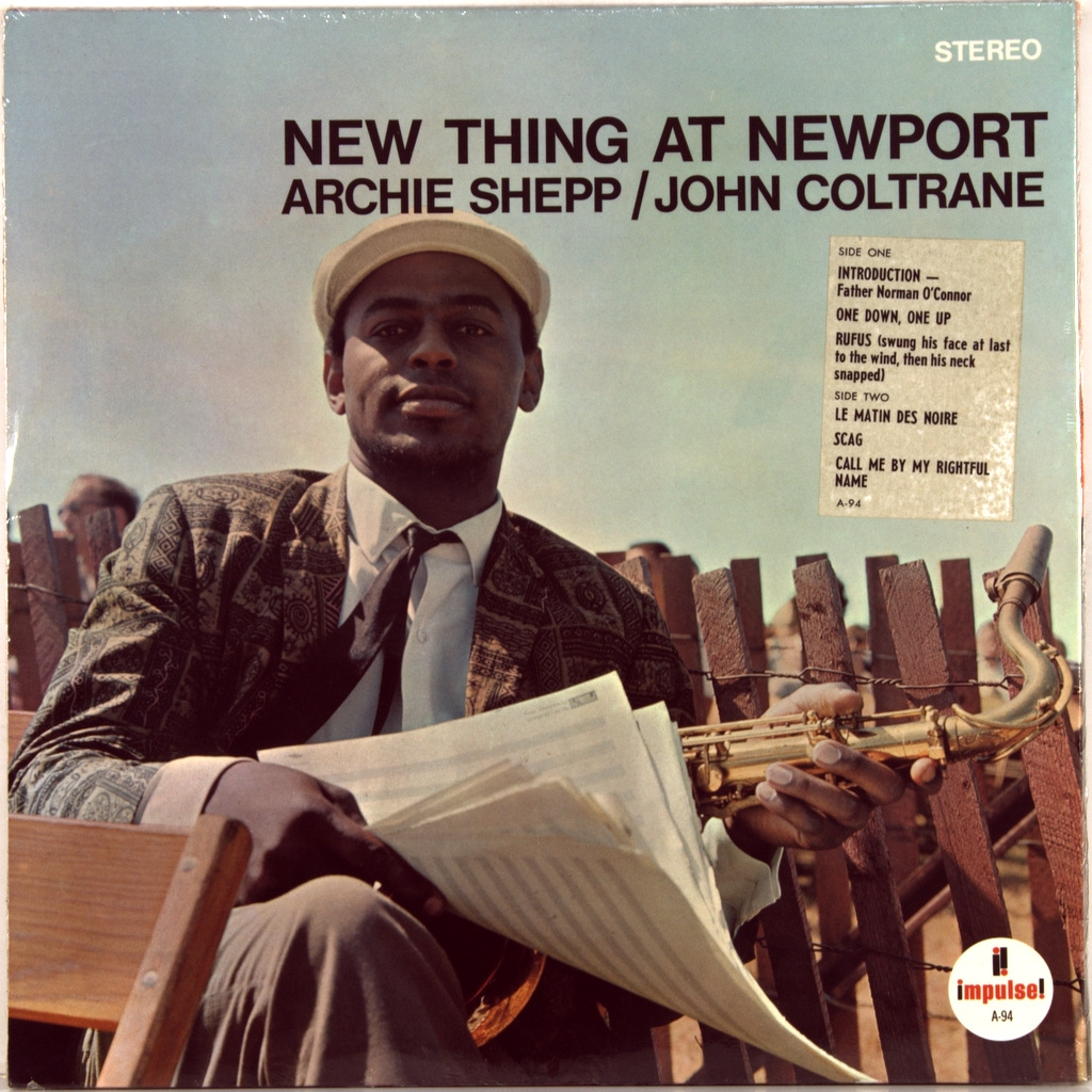 COLTRANE, JOHN / SHEPP, ARCHIE -NEW THING AT NEWPORT-1965-FIRST PRESS (STEREO) USA- IMPULSE-AS-94-A very rare American original of the cult album . A 1965 live album consisting of two separate sets from that year's Newport Jazz Festival, composed by tenor saxophonists John Coltrane and Archie Shepp. It was recorded four days after Coltrane's Ascension album recording session, at which Shapp appeared, and is one of several albums documenting the final stages of Coltrane's "classic quartet", which would begin to break up by the end of that year with the departure of McCoy Tyner. Reviewer Tim Niland wrote that both of Coltrane's performances are "explosive in their intensity" and "One Down, One Up" is "almost boiling at times." He stated: "Despite the audacity of the music, there are enough melodic hints in it, and the musicians are so obviously sincere in their desire to explore the world that the audience gives them great support." Nayland concluded: "Although the music on this CD must have come as something of a shock to those who were unprepared for it, listening to it in a historical context shows that this is a great example of the rapidly developing state of jazz in the mid-1960s by two of its most famous performers."