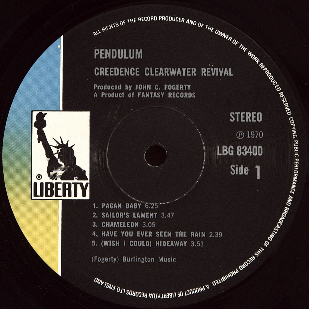 CREEDENCE CLEARWATER REVIVAL-PENDULUM-1970-THE FIRST UK PRESS-LIBERTY-LBG83400. Matrices A-1/B-1. A very rare British original of the cult album. Pendulum is the sixth studio album by American band Creedence Clearwater Revival, recorded at Wally Hyder's studio in San Francisco and released on the Fantasy label in December 1970. Pendulum is the last CCR album to feature rhythm guitarist Tom Fogerty, who left the band shortly after the album's release. The record demonstrates the group's desire to expand its own stylistic framework, a number of his compositions are musically noticeably more complex than the CCR recordings of the 1968-1969 sample. The most ambitious of the band's seven albums, Pendulum was recorded for about a month — twice as long as the rest of the records.