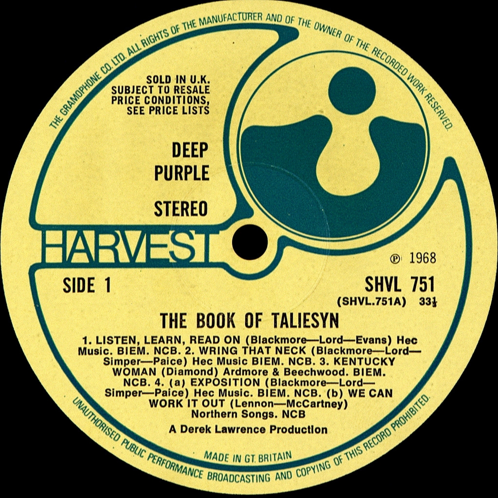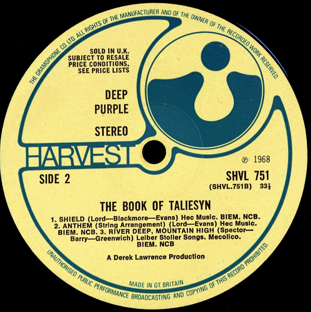 DEEP PURPLE-BOOK OF TALIESYN (STEREO)-1968-THE FIRST UK-HARVEST PRESS -SHVL751 Matrix A-1G/B-1G , stamper 1R/1O (Dream!) Mega rare British original of the first press (4-line sold in uk....) The Book of Taliesyn is the second studio album by British band Deep Purple. It was released in the USA in October 1968 on the Tetragrammaton Records label, and in the UK in June 1969 on the EMI label. The musical style of The Book of Taliesyn is a mix of progressive rock, psychedelic rock and hard rock[1][16][17][18][19]. Many reviewers believe that on this album the band demonstrated greater maturity and complexity of musical compositions than on the previous one. The album received a good rating in the USA, but like the previous one, it went completely unnoticed in the homeland of the musicians, in the UK. Five tracks out of seven were placed on the Billboard Hot100 in the middle of the hundred.
