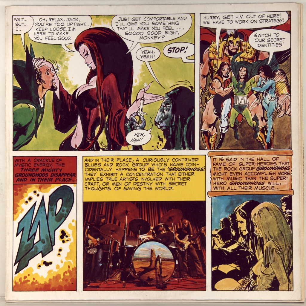 GROUNDHOGS-WHO WILL SAVE THE WORLD?-1972-FIRST PRESS UK-UA-UAG29237. Matrix A-1U/B-1U is a very rare British original of the cult prog blues band. WHO WILL SAVE THE WORLD?-A 1972 album recorded by The Groundhogs, originally released by United Artists Records in 1972, The cover is in the form of a comic book featuring groundhogs depicted by superheroes, drawn by comic book artist Neil Adams. In the story, they are fighting the personified evils of overpopulation, environmental pollution, war, "Pig Business" and "Sacred Cow" (religion), as well as a drug-addicted Monkey. Each of the band members is fighting their own evil, which has been hindering them from the very beginning, only for them to stand out and wreak havoc in another part of the globe. The lyrics of each song touch on these themes, and despite the comic nature of the cover, the lyrics are quite serious because they are politically and socially motivated.This was the first Groundhogs album to go beyond guitar/bass/percussion instruments, with McPhee using keyboards (mellotron and harmonium) on a number of tracks.
