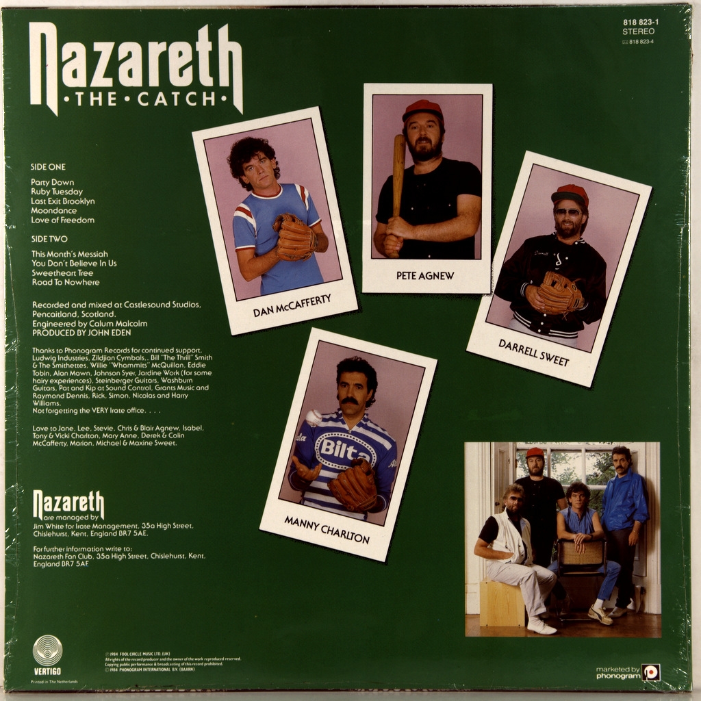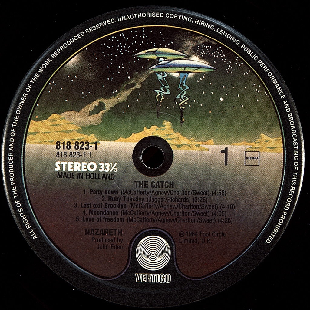 NAZARETH-THE CATCH-1984-THE FIRST HOLLAND-VERTIGO PRESS-818823-1.A very rare European original. Catch is the fifteenth studio album by the Scottish hard rock band Nazareth, released in 1984. In a sense, the album was a return to the Nazareth sound and album traditions, including songs such as "Ruby Tuesday" and "Road to Nowhere". German Albums (Offizielle Top 100) - 60th place. Norwegian Albums (VG-lista) - 12th place. Whereas in Britain and the USA the album was a flop.