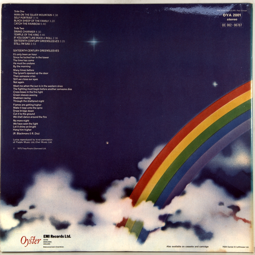 RAINBOW-RICHIE BLACKMORE'S RAINBOW-1975-The first UK-POLYDOR OYSTER press- OYA2001 KENDUN A-1U/B-1U matrices. Stamper 1MP/3OR. Ritchie Blackmore's Rainbow is the debut album by the British-American band Rainbow, released in May 1975. This CD took 11th place in the UK charts, and 30th in the USA. The album was a favorite for vocalist Ronnie James Dio, according to him.