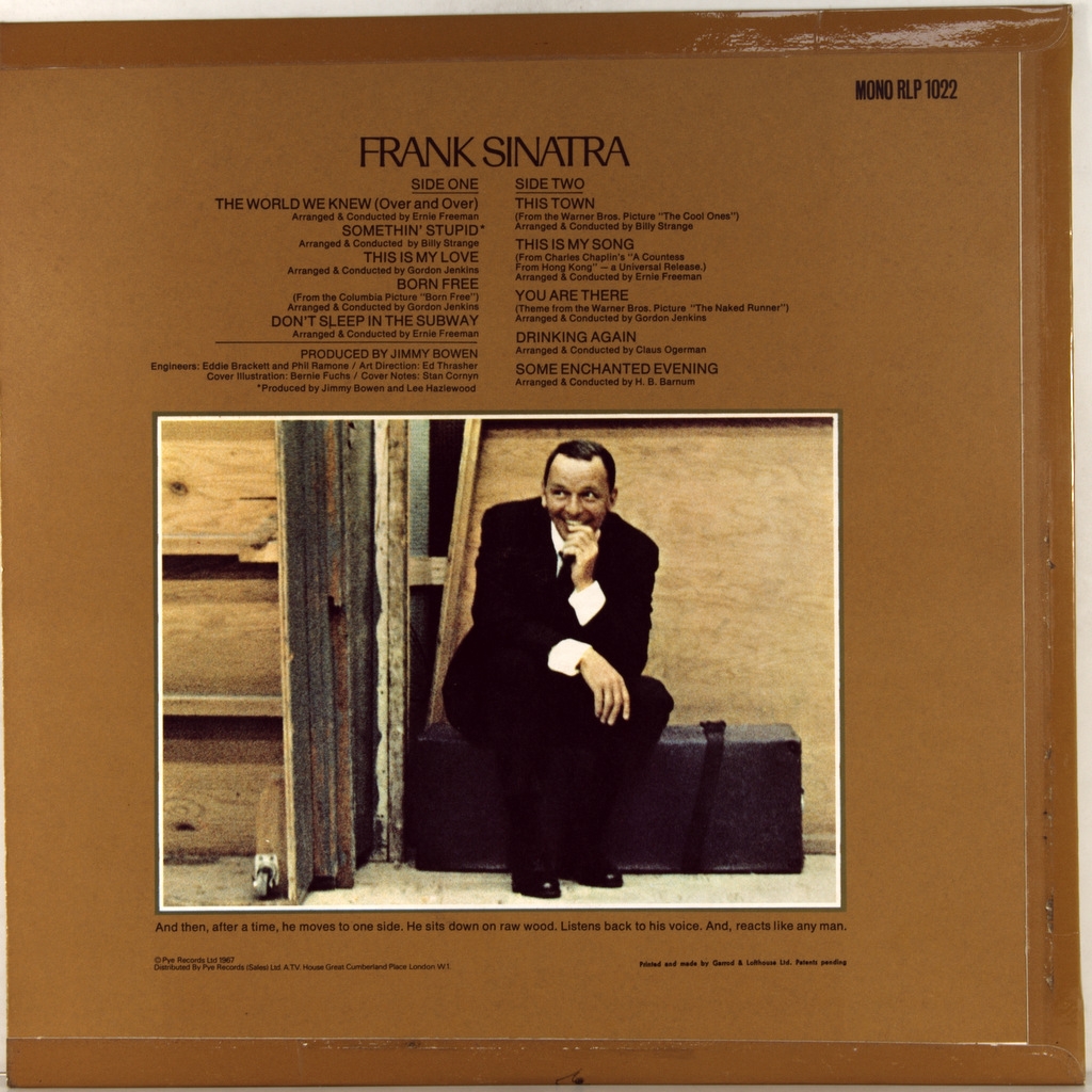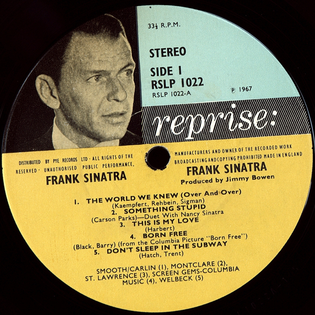 SINATRA, FRANK -THE WORLD WE KNEW -1967-FIRST PRESS (MONO) UK-REPRISE-RLP1022. A rare British original of the iconic album. The Frank Sinatra Album is a 1967 studio album by American singer Frank Sinatra. The album's title track reached number 30 on the US Billboard Hot 100 chart and number 1 on the Easy Listening chart in 1967. His second track "Somethin' Stupid" — a duet between Sinatra and his daughter Nancy — reached No. 1 on both charts.