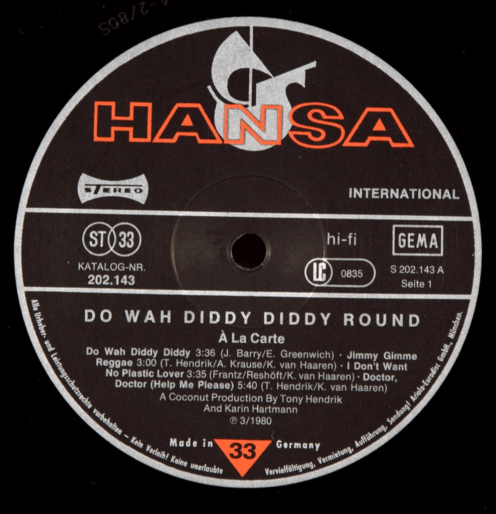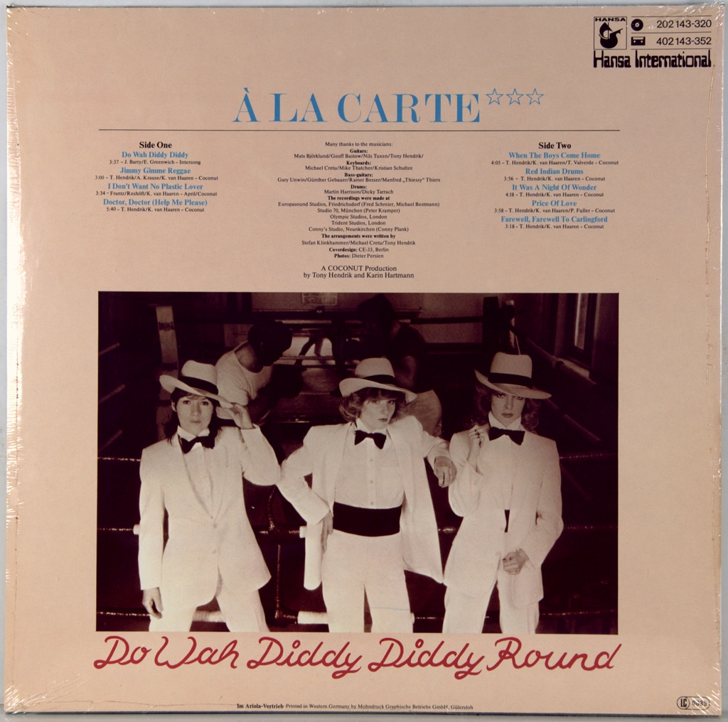 A LA CARTE-DO WAH DIDDY DIDDY ROUND-1980-THE FIRST PRESS OF GERMANY-HANSA-202143 is a rare original of the cult disco group. A La Carte is a pop disco girl group founded in 1978 in Germany. Producers Tony Hendrik and Karin Hartmann helped create the band. Initially, the trio consisted of three British girls: Patsy Fuller, Julia and Elaine. Their first song was When the Boys Come Home, released in March 1979. After appearing on the TV show Musikladen, the band gained huge popularity in Germany. For unknown reasons, the line-up often changed with the release of new singles. Jenny Renshaw became the only permanent member, joining the band in October 1979. By 1981, the band consisted of Jenny Renshaw, Linda Daniels, and Joy Martin. Together they released the album Viva. Subsequently, the band's line-up changed several times. In 1982, they recorded the album "Rockin' Oldies", which included numerous covers of songs from the 1960s. The band broke up in 1984.