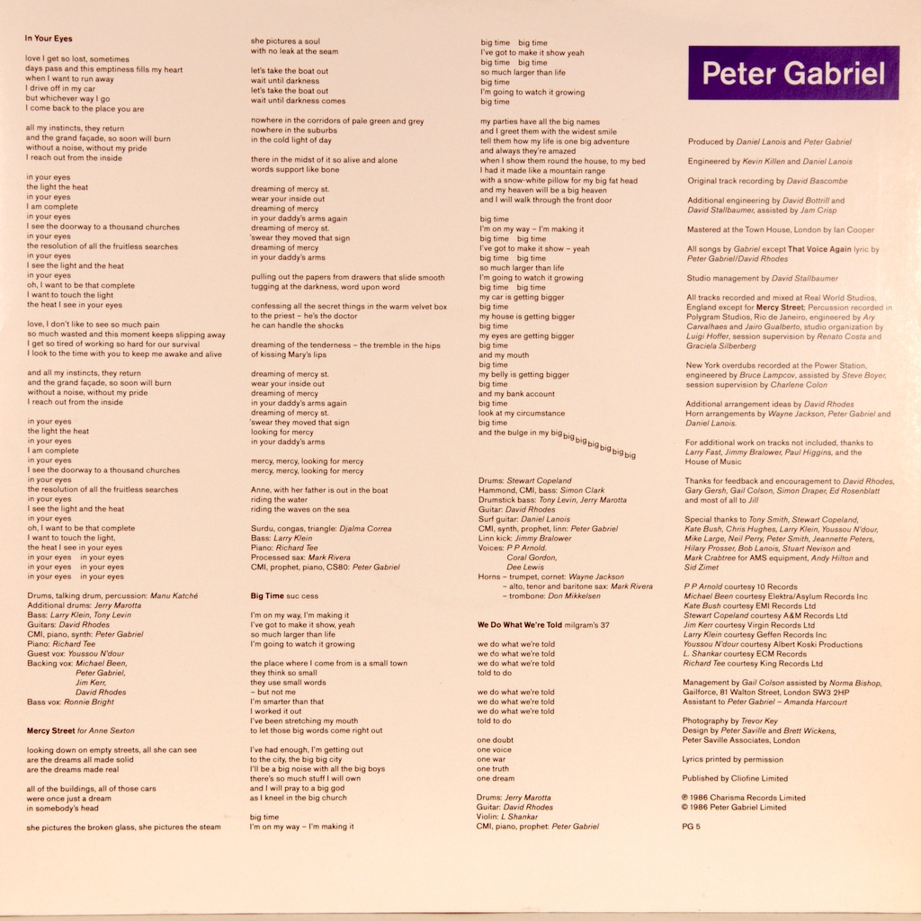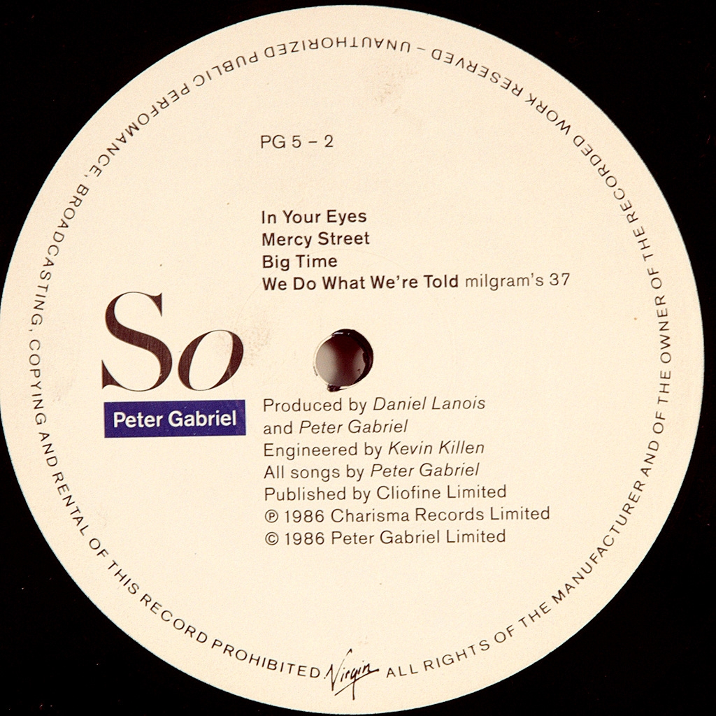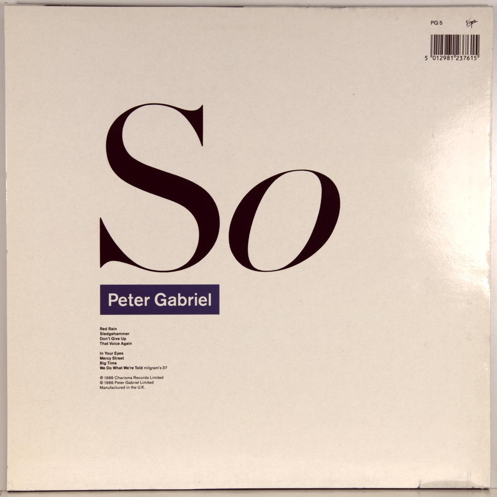GABRIEL, PETER-SO-1986-UK FIRST PRESS-VIRGIN room PG5-1. Matrix A-4U/B-5U. Rare British original.So — most successful album in the career of Gabriel, he reached the top of the British chart, and became #2 in the United States. In the UK, the CD was certified three times platinum in the U.S. — five times. Rolling Stone magazine put it at 14th place in its list of "the 100 best albums of the eighties"