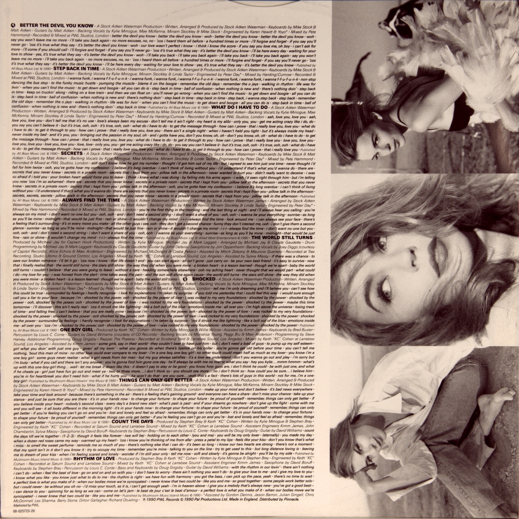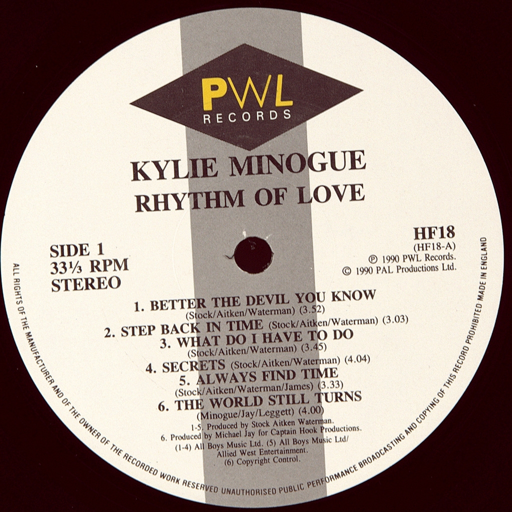 MINOGUE, KYLIE-RHYTHM OF LOVE-1990-FIRST UK PRESS-PWL number PWLHF18.A rare original of the famous pop diva. Rhythm of Love is the third studio album by Australian singer Kylie Minogue, released on November 12, 1990 in the UK on the PWL label and on December 3 of the same year in Australia on Mushroom Records. The recording of the album began in March 1990 and lasted until September. The main producers of the album were Stock, Aitken and Waterman. Minogue has also collaborated with a number of American authors and producers, including Keith Cohen, Stephen Bray and Michael Jay. The singer began to take part in songwriting: Rhythm of Love includes four compositions, co-authored by Minogue.