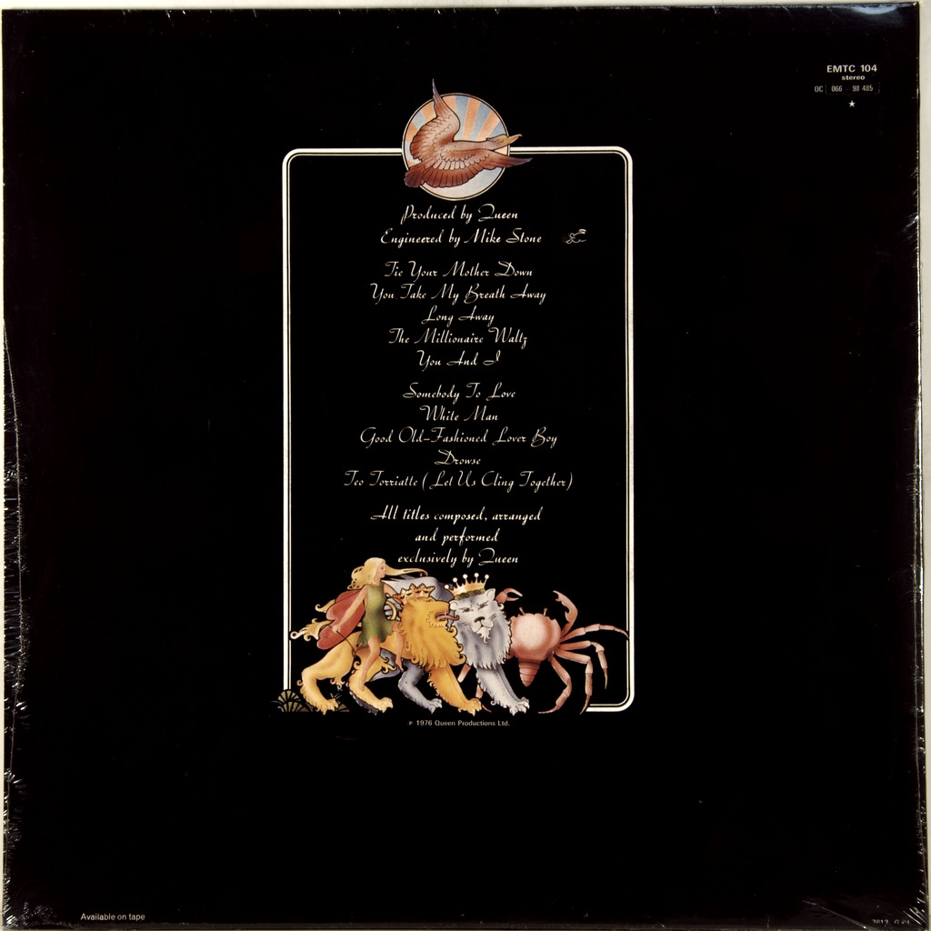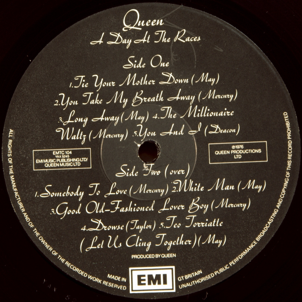 QUEEN-A DAY AT THE RACES-1976-ORIGINAL PRESS 1981 UK-EMI number EMTC104 Matrix A-6/B-6U.A rare British edition of the iconic album. A Day at the Races is the fifth studio album by the British rock band Queen, released on December 10, 1976 in the United Kingdom and December 18, 1976 in the United States.The album's title, "A Day at the Races," is taken from the repertoire of the American comedians of the 1930s, the Marx brothers. A Day at the Races immediately came under fire from critics. Queen was accused of unsuccessfully trying to repeat A Night At The Opera. The album turned out to be really very similar to the previous one, but it was never hidden by the musicians. May said that both records were being prepared at the same time, but one was recorded earlier and the other later.