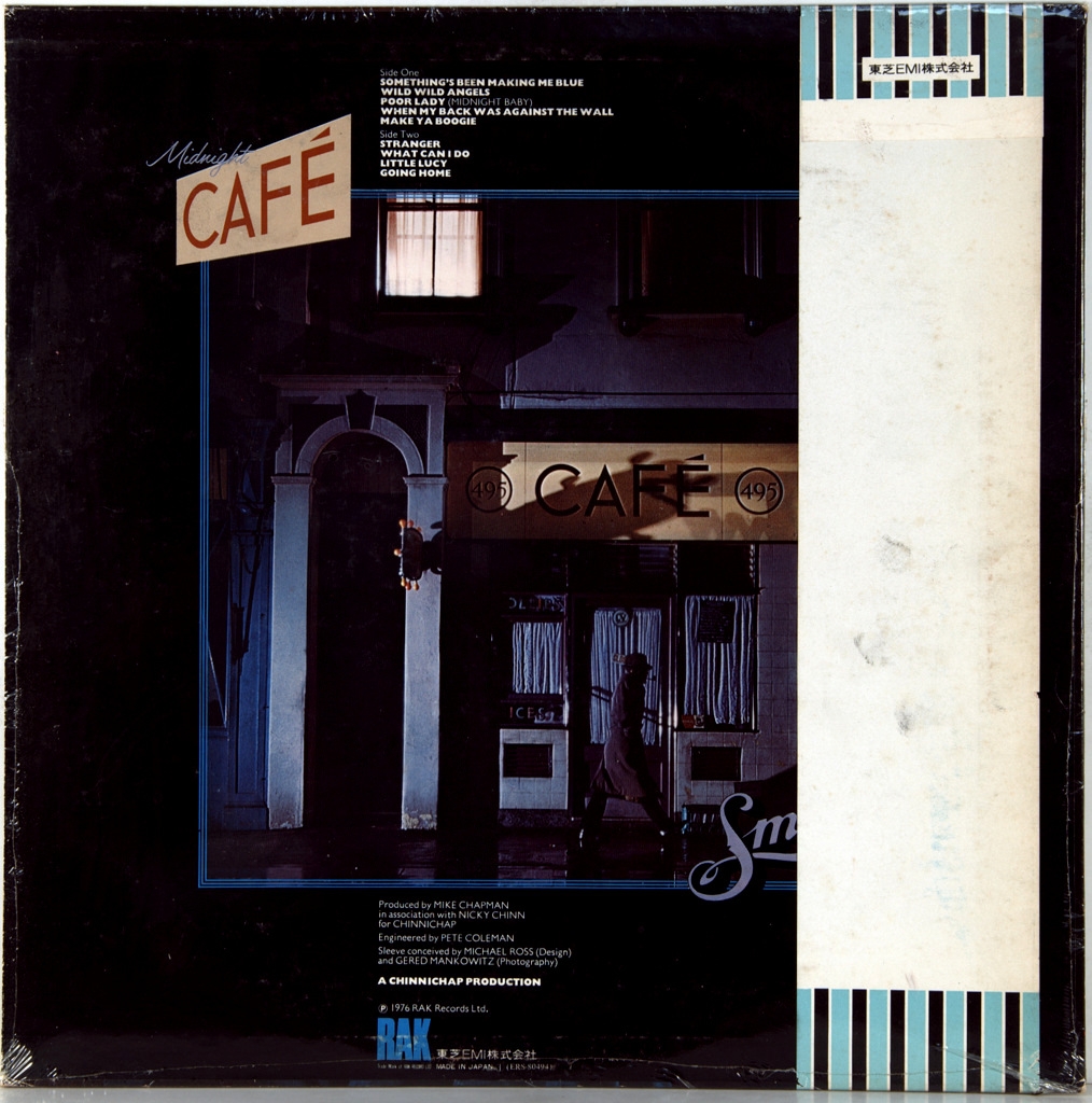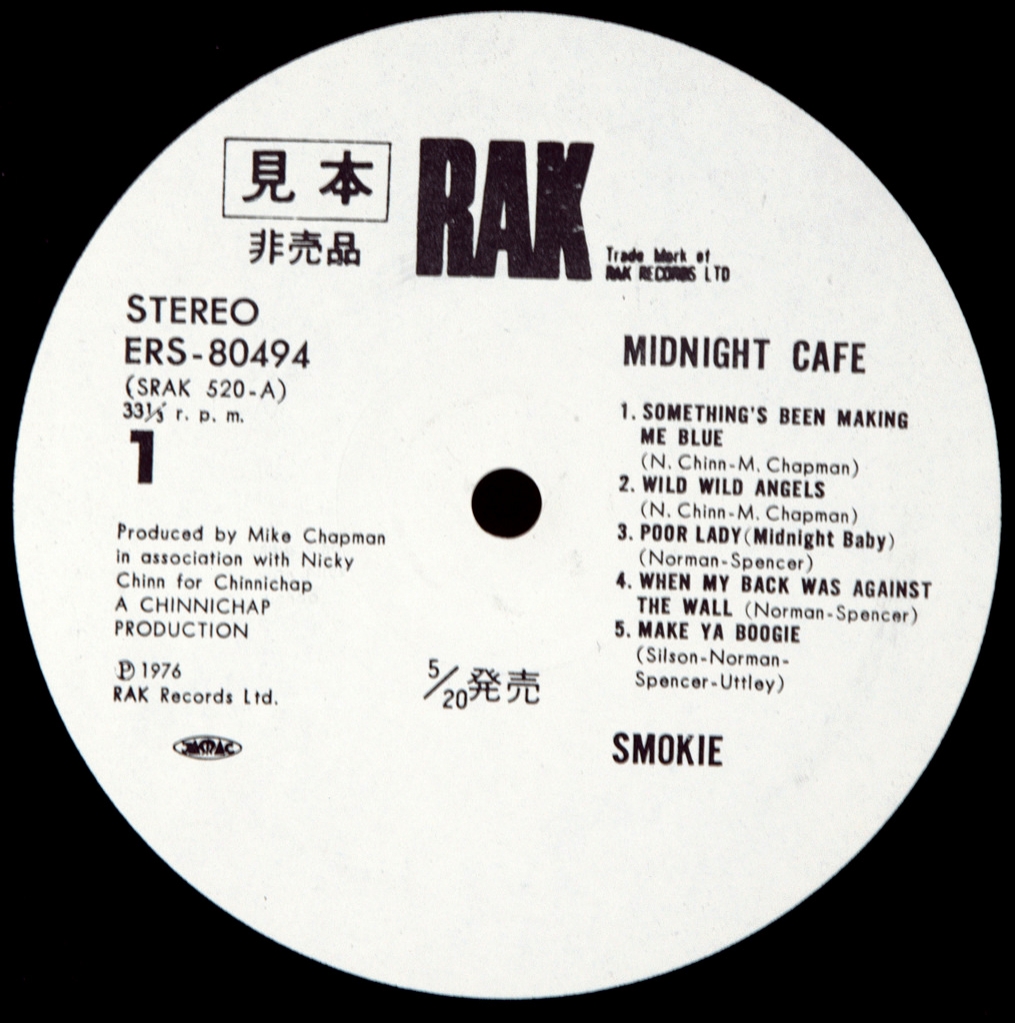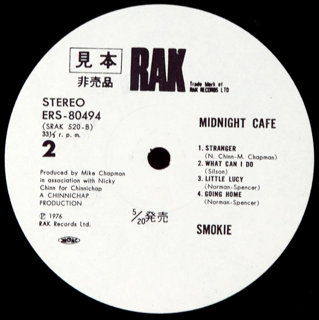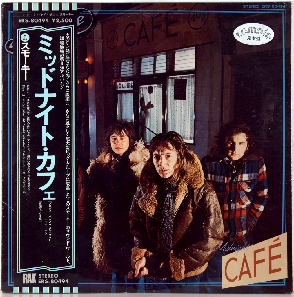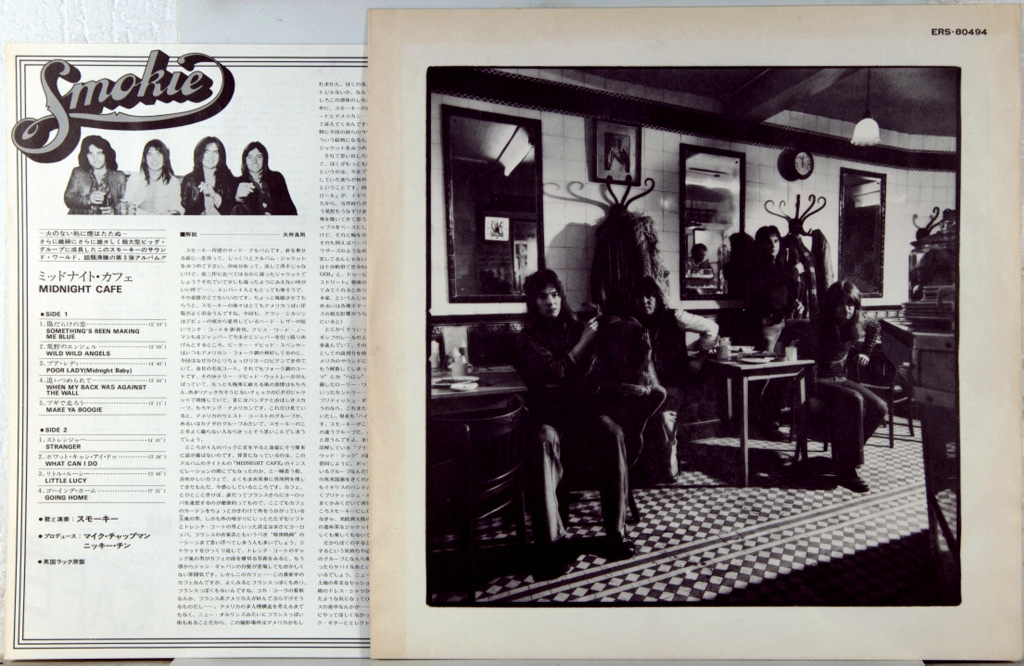 SMOKIE-MIDNIGHT CAFE-1976-THE FIRST PRESS (PROMO) JAPAN-RAK-ERS-80494. A very rare Japanese promo original of a cult album. After a good start in 1975, on a wave of growing popularity, the band went to California and began work on their 3rd album at Whitney Recording Studios. Where he actually records all the material for the album, only "What Can I Do" was recorded at London's Audio International Studios. Did you make a record, where would you think? On the iconic Abbey Road! The recording featured the classic "golden" Smokie line-up: Chris Norman guitar, piano vocals, Alan Silson guitar vocals, Terry Uttley bass guitar backing vocals, and Pete Spencer drums backing vocals.The length of the album is 43 minutes, 4 of the ten songs belong to the pen of "Double CHE", the rest are written by the members of the group."What Can I Do" was written by Alan Silson, and he also sang it. Mike Chapman produced the album, and it's noticeable, as they say, "with an unarmed ear," his signature violins are unmistakable.The album turned out to be very solid, it listens in one breath, not a single passing thing, it was on it that the very "branded" sound was finally formed, for which we loved Smokie so much. The album was released on April 9, 1976, the producer is EMI records, the copyright to the recording belongs to RAK records, on apples The company's RAC sailboat is on display. To promote the album, 3 singles were released during 1976: "Something's Been Making Me Blue", "Wild Wild Angels" and "I'll Meet You At Midnight". All of them came from the pen of Double Che, all were successful, and "I'll Meet You At Midnight" generally became the number on duty of all pioneer discos of the Soviet Union.