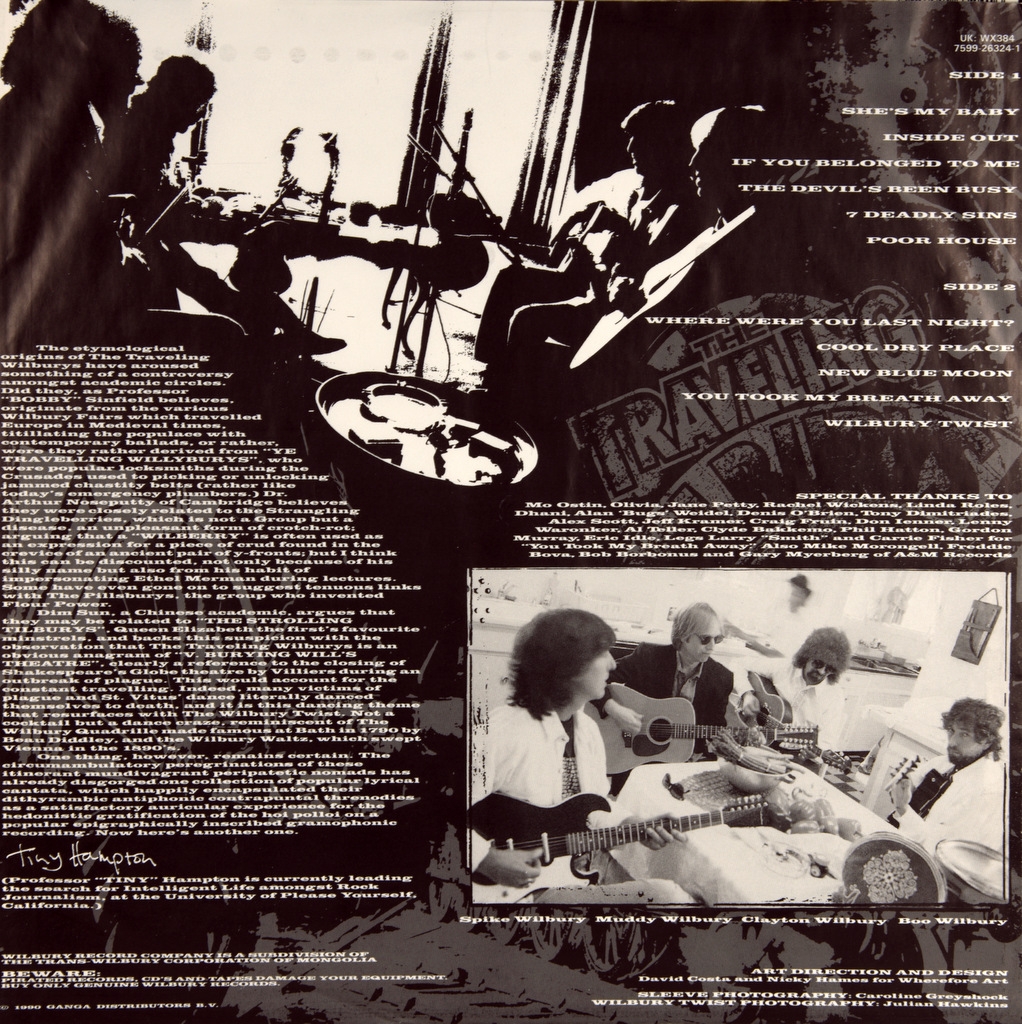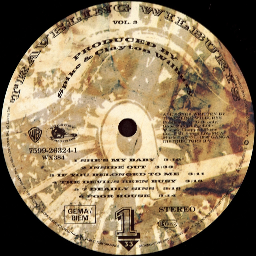 TRAVELING WILBURYS-VOL.3-1990-FIRST PRESS UK/EU GERMANY-WILBURY- 075992632416. The second and last album of the supergroup The Traveling Wilburys (the stellar line-up), recorded and released in 1990. Released in October 1990, the album was less positively received than Vol. 1, but still had a fair success. In the United States, "She's My Baby" (with guest guitarist Gary Moore) and "Inside Out" became radio hits, charting 2nd album rock and 16th album rock respectively. The album peaked at number 14 in the UK and number 11 in the US, where it was certified platinum by the RIAA.