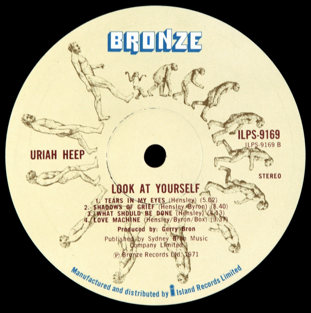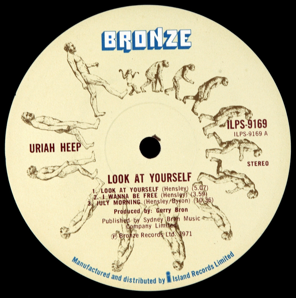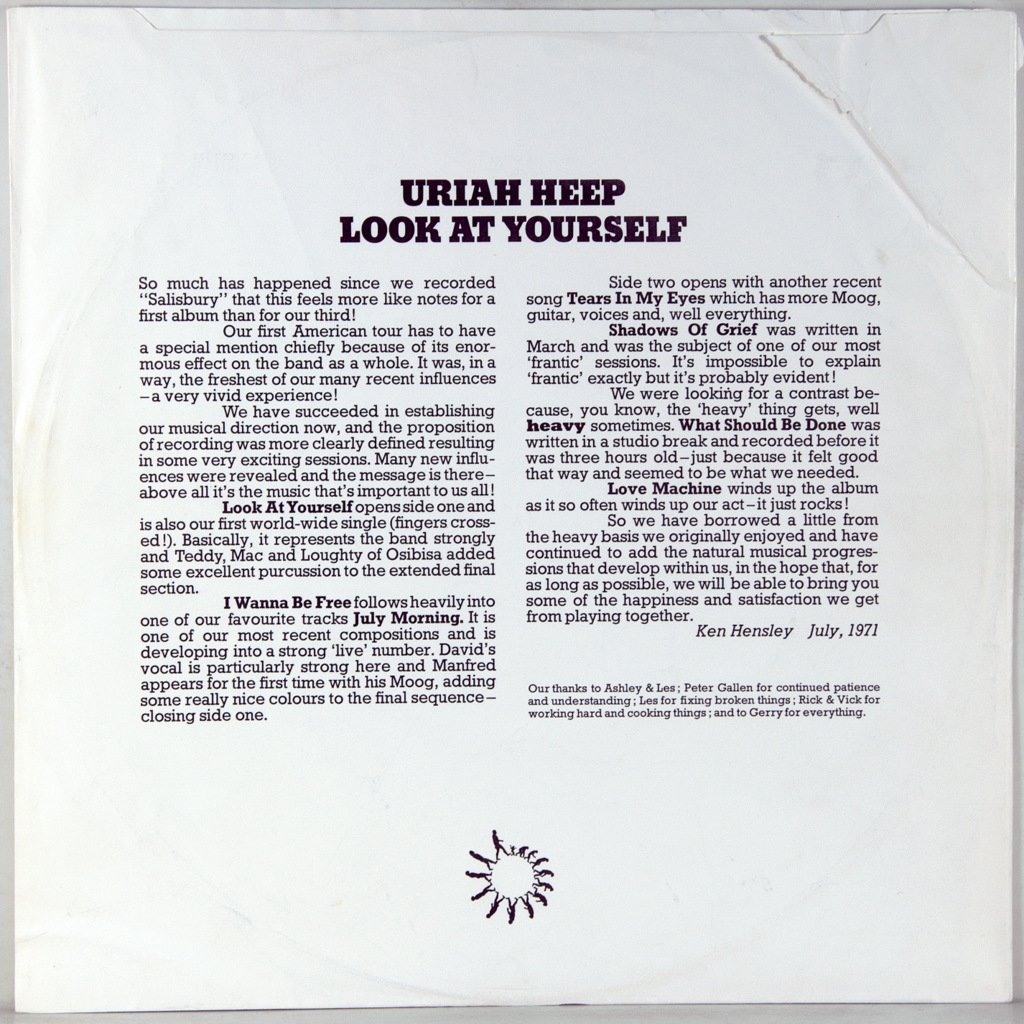 URIAH HEEP -LOOK AT YOURSELF-1971-SECOND PRESS 1972 UK-BRONZE-ILPS-9168. Matrices A-1U/B-1U. 1G/1RO PORKY stamper. A mega rare original of the iconic album.Look at Yourself is the third studio album by British rock band Uriah Heep, recorded by the band with producer Gerry Bron at Lansdown Studious in July 1971 and released in October 1971 by Bronze Records, the album was released in the United States on Mercury Records. The CD rose to #39 on the UK Albums Chart and to #93 on the Billboard 200. The title track was released as a single in the US, UK and several European countries in 1971. In 1973, a live version of "July Morning" was released as a single in the United States. The original version of the cover provided for a slot and a "mirror" made of foil, in which the viewer saw his distorted image.