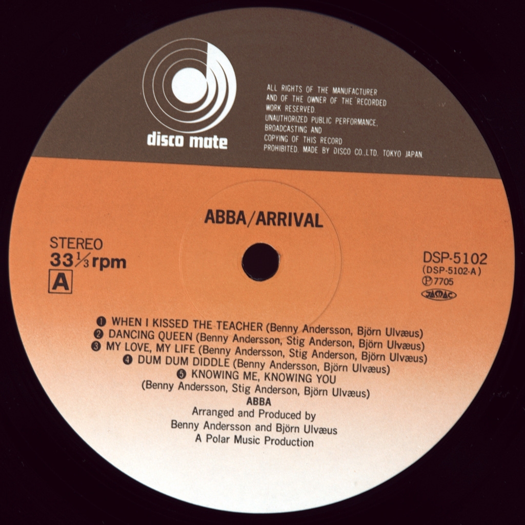 ABBA-ARRIVAL-1976-ORIGINAL PRESS 1978 JAPAN-DISCO MATE-DSP-5102. A rare Japanese early edition . Arrival is the fourth studio album by the Swedish band ABBA, released in 1976. Arrival reached the top of the sales rankings in Sweden, Holland, Germany, Great Britain, Australia, Mexico, New Zealand. The single from this album, "Dancing Queen", reached the first position in the US charts and is ABBA's most successful record in this country.