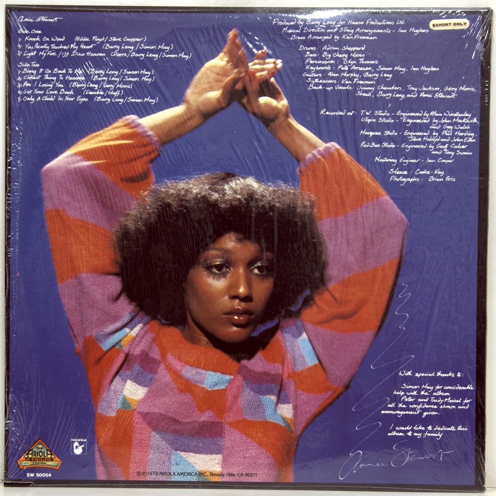 AMII STEWART- KNOCK ON WOOD- 1979-THE FIRST USA PRESS- ARIOLA-SW-50054. A rare original from a famous disco band. Knock on Wood is a studio album by Amy Stewart, released in February 1979. The album contained two successful singles: "Knock on Wood" (#1 in the US in the pop genre, #6 in the US in the RB genre, #5 in the US in the club music genre, #6 in the UK, #13 in Germany) and "Light My Fire / 137 Disco Heaven" (#69 in the US in the pop genre, #36 in the US in the RB genre, #5 in the UK, #26 in Germany). In 1985, a double single with remixed versions of "Knock on Wood" and "Light My Fire" reached number 7 in the UK charts, followed by the re-release of "You Really Touched My Heart" (number 89 in the UK).