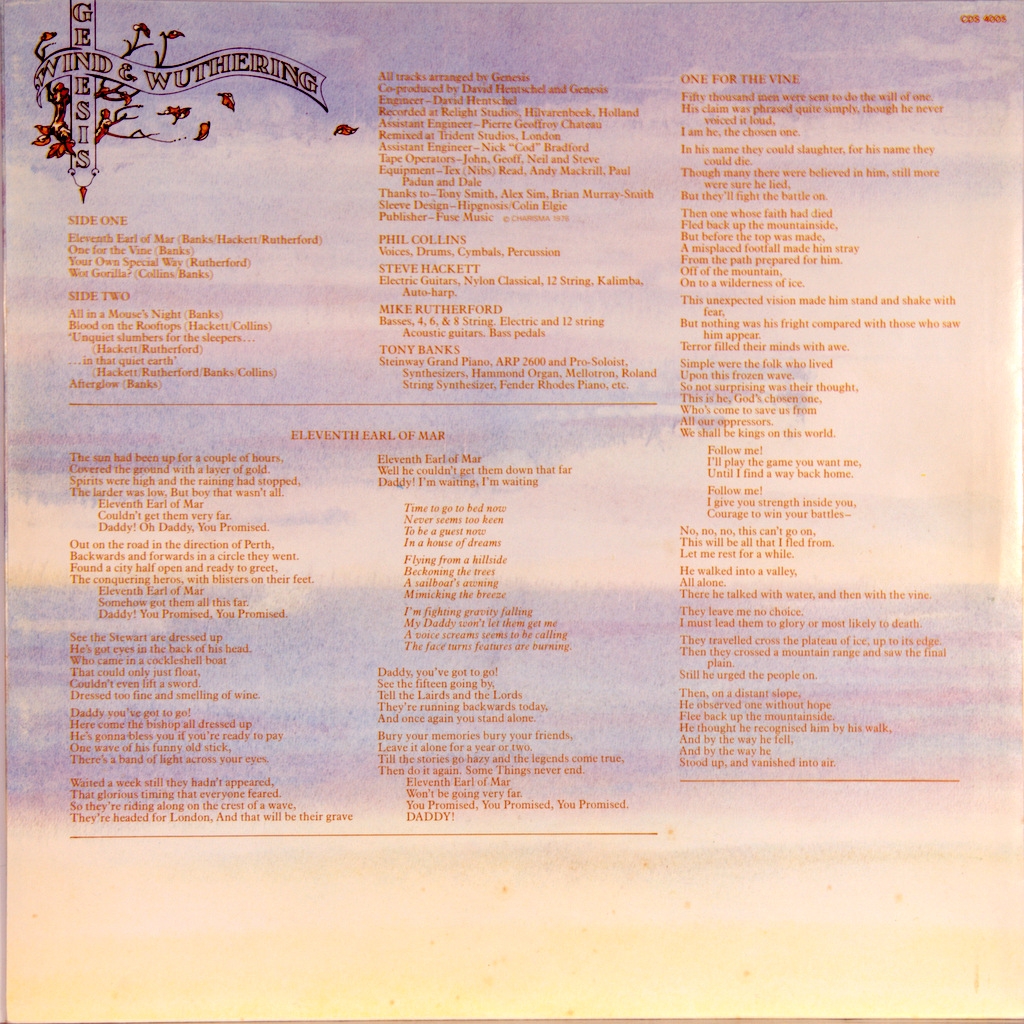 GENESIS-WIND AND WUTHERING-1976-THE FIRST UK PRESS-CHARISMA - CDS4005. Matrixes A-2/B-3. A rare British original of the cult band. Wind and Wuthering is the eighth studio album by the English progressive rock band Genesis. It was released on December 17, 1976 on Charisma Records and is their last studio album featuring guitarist Steve Hackett. After the success of their 1976 tour in support of their previous album, A Trick of the Tail, the band moved to Hilvarenbeek in the Netherlands to record their next album, their first recorded outside the UK. Writing and recording caused internal friction, as Hackett felt that some of his contributions had been rejected in favor of material by keyboardist Tony Banks. The album received a positive response from critics and boosted the band's popularity in the United States. It reached No. 7 in the UK and No. 26 in the US and sold steadily, eventually receiving Gold Certification from the British Phonographic Institute and the Recording Industry Association of America. The single "Your Own Special Way" became the band's first single on the US charts, peaking at 62nd place.