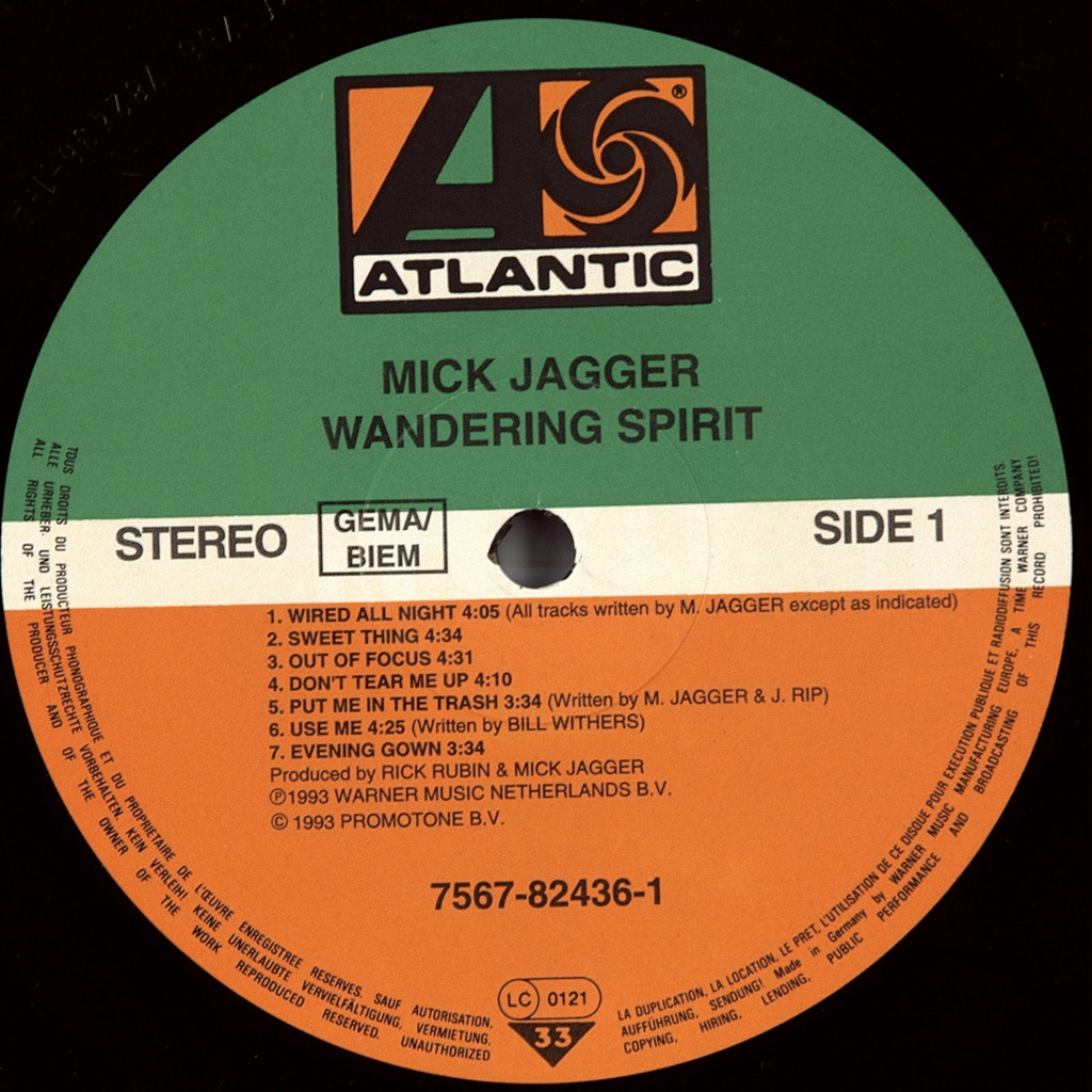 JAGGER, MICK-WANDERING SPIRIT-1993-FIRST PRESS UK/EU-GERMANY-ATLANTIC- 7567-82436-1. A rare original solo album from the 90s. Wandering Spirit is the third solo album by Mick Jagger, released in 1993. It became his only solo album released in the 1990s, and was co-produced by Jagger and Rick Rubin. The album was a commercial success, peaking at number 12 in the UK and number 11 in the US, receiving a gold certification from the RIAA.