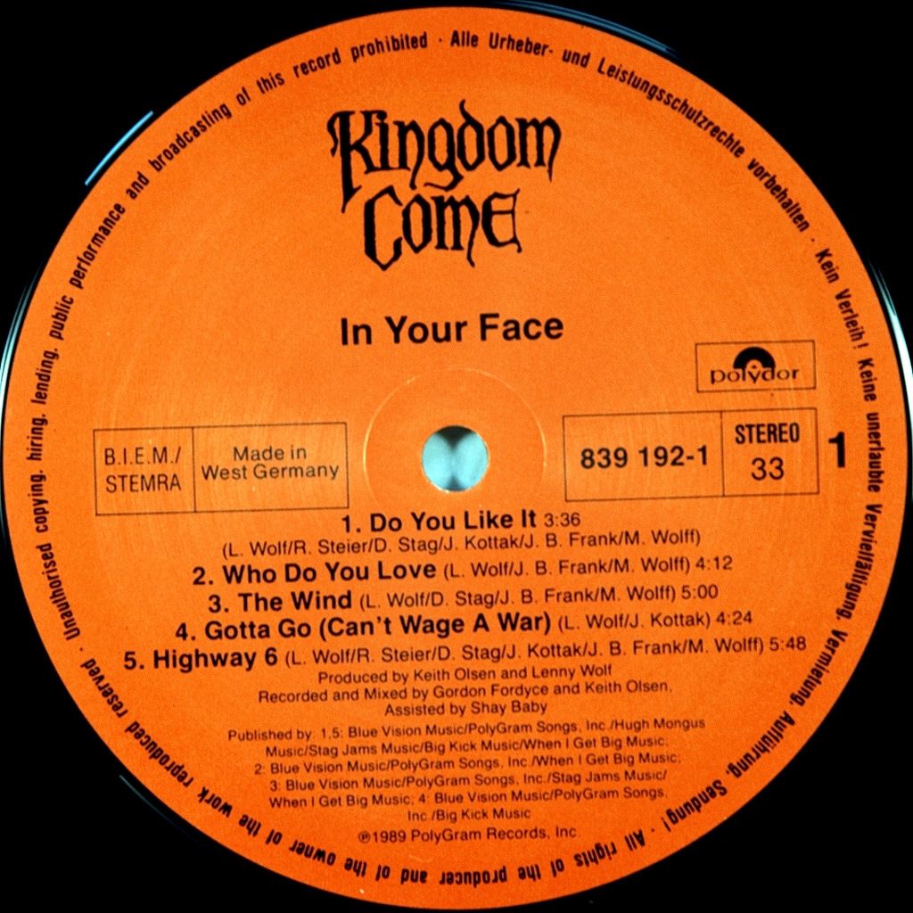 KINGDOM COME-IN YOUR FACE-1989-First press EU-GERMANY-POLYDOR number 83912-1. A very rare European original of the cult album.. The second album by the German-American hard rock band Kingdom Come. Singles from the album charted in the UK.