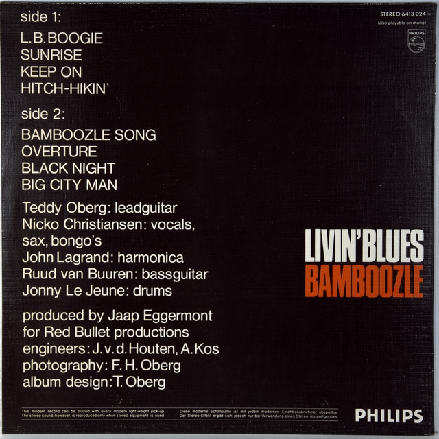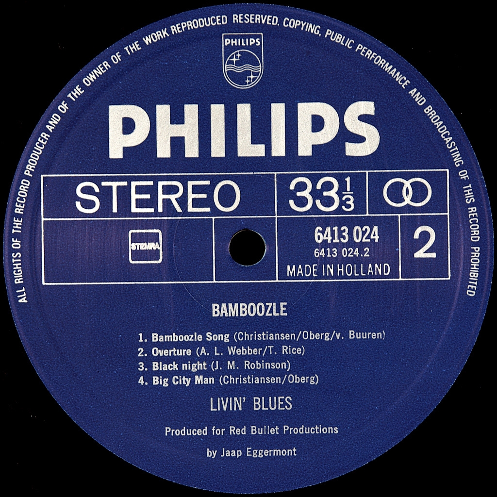LIVIN' BLUES-BAMBOOZLE-1972-THE FIRST PRESS OF HOLLAND-PHILIPS-6413 024, A very rare original of the iconic blues album by the Dutch band. Livin' Blues — Bamboozle (1972) The third studio album by the Dutch band Livin’ Blues, released in 1972 on the Philips label. Almost all the songs were written by Oberg and Christiansen, with the exception of the beautifully played ”Overture" Andrew Lloyd Webber and a cover of the song “Black Night” by American musician J.M. Robinson. The musicians relied on the next hit “L.B. Boogie", which set the mood for the whole album. But it turned out to be lively and bright – eight compositions from boogie rock to rhythm and blues. There was also a place for light sadness in it – Ted Oberg's instrumental composition “Sunrise”. In 1971, Dick Beckman was forced to leave the band, he was replaced by Johnny Le Jeune (ex-Island), a man who had been playing drums since the age of 5, a member of several Dutch bands. With him, the band recorded their third album with the strange name Bamboozle. The new drummer didn't last long for this album, then he joined the Schick Band. Tours began in Europe, where the arranged track "Overture" by Andrew Lloyd Webber and Tim Rice (from Jesus Christ Superstar) was a great success.