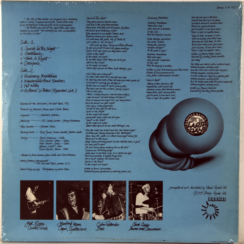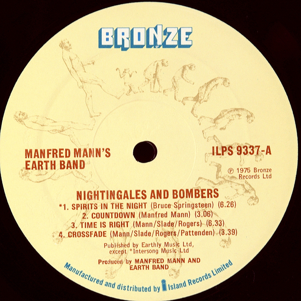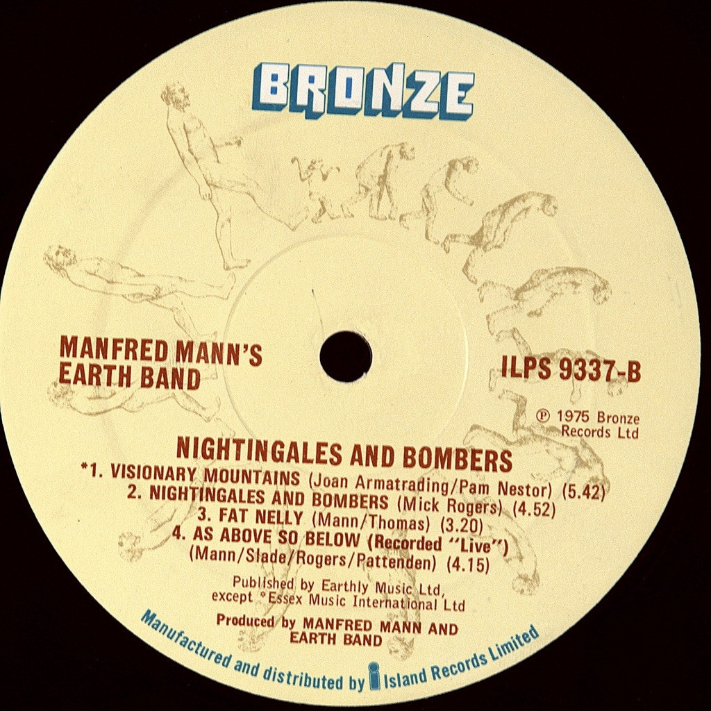 MANFRED MANN'S EARTH MAND-NIGHTINGALES AND BOMBERS-1975-THE FIRST PRESS (CONTRACT) UK-BRONZE- ILPS 9337. A-3/B-3 matrices, A rare British original from the CBS contract factory. The pinnacle of the band's creativity. Nightingales AND Bombers is the sixth studio album by British rock band Manfred Mann's Earth Band, released on August 22, 1975 on the Bronze Records label. The CD rose to #120 on the Billboard 200 of all rock albums.