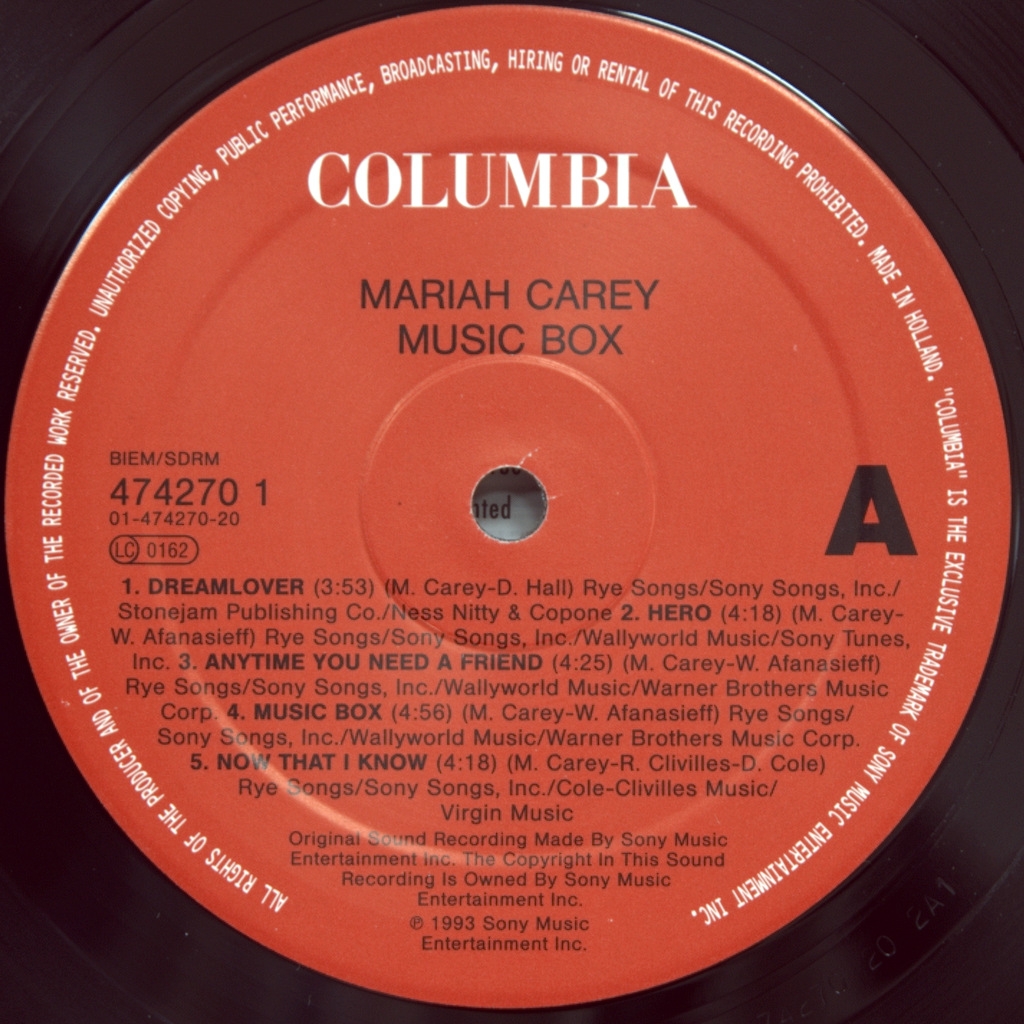 MARIAH CAREY- MUSIC BOX- 1993-FIRST PRESS UK/EU- HOLLAND-COLUMBIA-474270-1 Rare European Original pop divas. Music Box is the third studio album by American singer and songwriter Mariah Carey. It was released by Columbia Records on August 31, 1993. The album consists of ballads written mainly by Carey and Walter Afanasieff, with whom she previously worked on Emotions (1991), as well as several dance tracks. While working on the album, Carey wanted to expand her audience by choosing a more pop-oriented/RB-oriented sound. During this time, she experimented with various musical instruments, which led to the fact that the sound of the album began to differ from the two previous, more modern works. Upon its release, Music Box received generally mixed reviews from music critics. The album was criticized for Carey's softer and more laid-back tone compared to her previous works. Commercially, the album reached number one in 15 countries, including Australia, France, Germany, the United Kingdom and the United States.The Recording Industry Association of America (RIAA) awarded it diamond status for sales of ten million copies in the United States. "Music Box" remains Carey's best-selling album with 28 million copies sold worldwide and is one of the best-selling albums of all time.