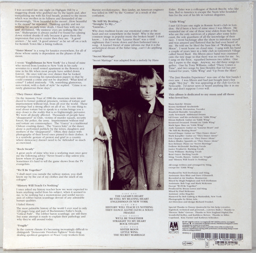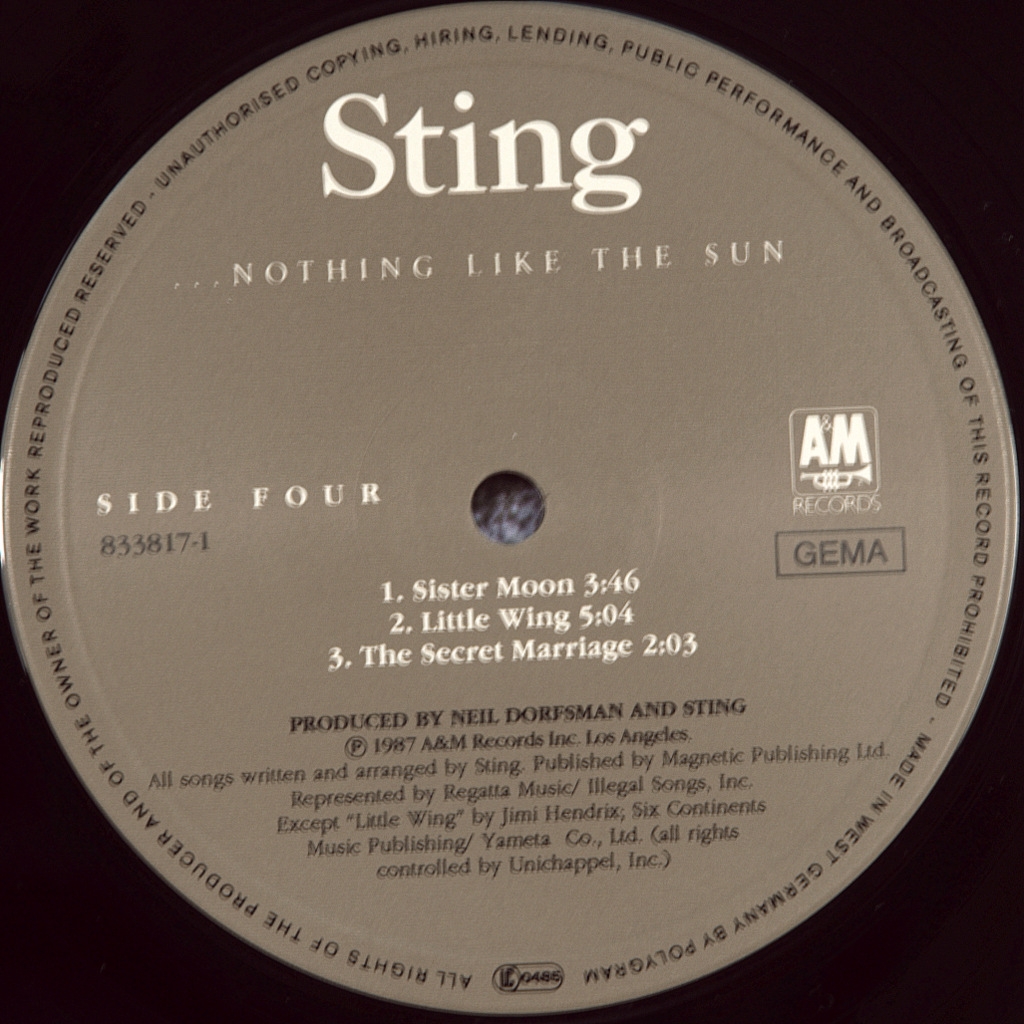 STING-NOTHING LIKE THE SUN (2LP)-1987-FIRST GERMANY PRESS-A&M - 393912-1. ...A very rare original Nothing Like the Sun is the second Studio album by British rock musician sting, was issued October 13, 1987. The name of the album was inspired by a line from the 130th sonnet of William Shakespeare "My mistress' eyes are nothing like the sun" Album won in the category "Best British album" at the Brit Awards in 1988.