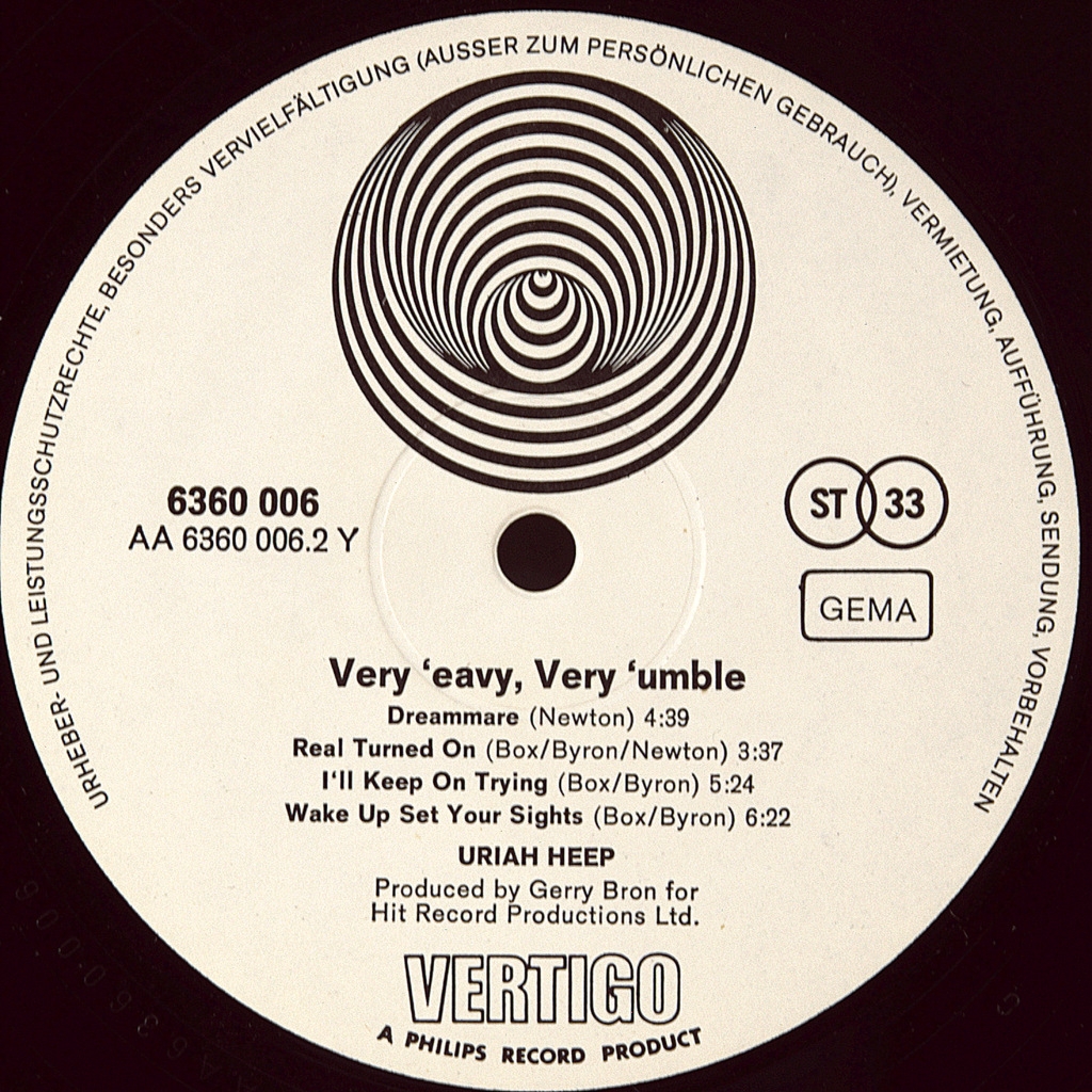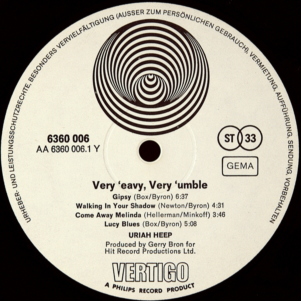 URIAH HEEP-...VERY 'EAVY VERY 'UMBLE-1970-THE FIRST PRESS OF GERMANY- VERTIGO SWIRL-6360006. A very rare German original of the cult album. The album was released in June 1970 by Vertigo Records in the UK. The original vinyl release was a spread-out envelope with frontman David Byron depicted on the front sleeve, almost unrecognizable under the cobwebs. It was released in August 1970 by Mercury Records in the United States under the name just Uriah Heep with a different cover design (a centipede-type monster) and with the track "Bird of Prey" instead of "Lucy Blues". The album was re-released by Bronze Records in 1971 after the band signed a contract with that label. The album shows how the band tries different genres – a mix of heavy metal and progressive rock, rather than hard rock, which they became known for on later albums. Tracks 3 and 8 were recorded as Spice songs before the band's renaming to Uriah Heep, and featured session musician Colin Wood on keyboards. When Ken Hensley joined Spice in early 1970, the tracks were not re-recorded.