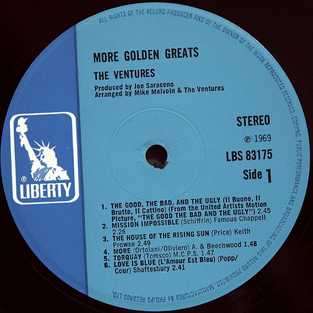 VENTURES- MORE GOLDEN GREATS-1969-THE FIRST UK PRESS-LIBERTY-LBS83175 Rare original of the cult album..The Ventures is an American instrumental rock band formed in Tacoma, Washington in 1958 by Don Wilson and Bob Bogle. The band, which was a quartet for most of its existence, helped popularize the electric guitar around the world in the 1960s. Although their popularity waned in the United States in the 1970s, the band remains especially revered in Japan, where they regularly tour. The classic line-up consisted of Wilson (rhythm guitar), Bogle (originally lead guitar, later bass), Nokey Edwards (originally bass, later lead guitar) and Mel Taylor (drums).