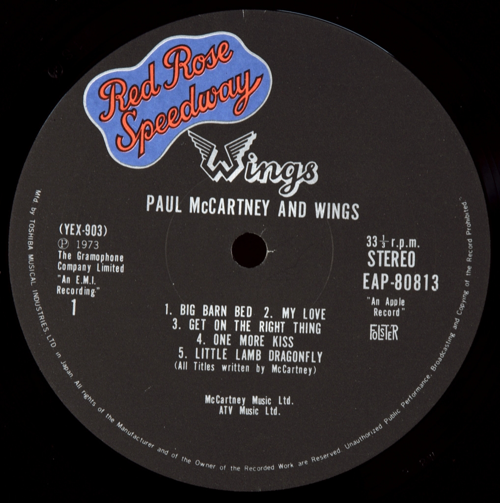 WINGS-RED ROSE SPEEDWAY-1973-FIRST PRESS JAPAN-APPLE -EAP-80813 Rare Japanese original of the cult album. Red Rose Speedway is the second album by Paul McCartney and the Wings group he created (it is the fourth in Paul McCartney's discography outside and after his participation in The Beatles), released in 1973 by Apple Records after the relative commercial failure of Wings' debut album Wild Life (perhaps one of the reasons for this failure was that the authors-the performers of the album were the little—known band Wings, without mentioning in the band's name that it was McCartney's band). The album reached the 1st position on the Billboard 200 chart.