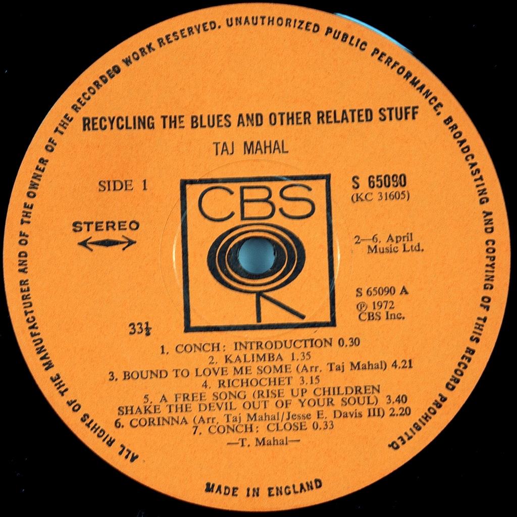 TAJ MAHAL-RECYCLING THE BLUES & OTHER RELATED STUFF-1972-FIRST UK PRESS-CBS - number S65090. Rare Blues original.