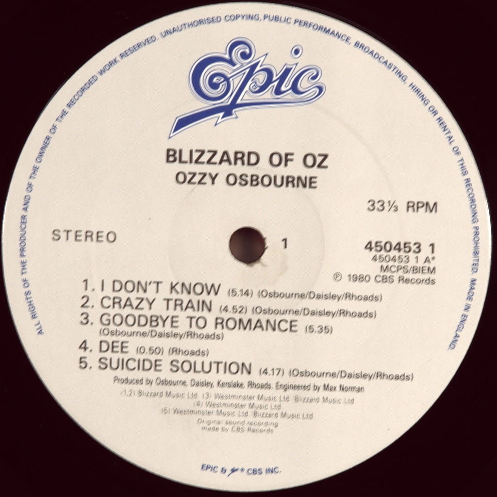 OSBOURNE, OZZY-BLIZZARD OF OZZ-1980-SECOND PRESS 1984 UK EPIC number 4504531.