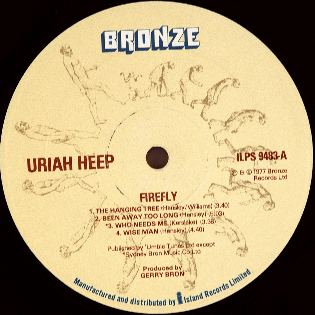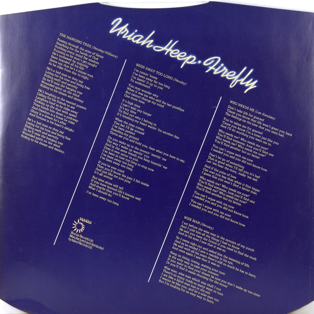 URIAH HEEP-FIREFLY-1977-FIRST PRESS UK-BRONZE ILPS9483. matrices A-1/B-1 . A very rare British original of the iconic album. Firefly is the 10th studio album by British rock band Uriah Heep, released in February 1977 on Bronze Records in the United Kingdom and Warner Bros. Records in the United States. It was the band's first album without David Byron, the former lead vocalist and founding member of the band, who was replaced by John Lawton. Bassist Trevor Bolder made his debut with Uriah Heep on this album and, apart from an 18-month hiatus in the early 1980s, he was a member of this band until his death in 2013. The album was successful and placed in the top 20 of the European charts. In the Billboard 200 Rock Albums of All Time, it ranks 166th.