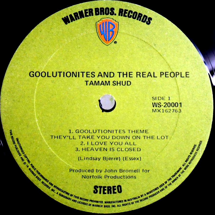 TAMAM SHUD – GOOLUTIONITES AND THE REAL PEOPLE-1970-AUSTRALIA FIRST PRESS-WARNER BROS number WS-20001. Mega rare second album by Australian progressive geniuses. Australian prog-psychedelic, innovative rock band.Formed in Newcastle in 1964. Released two albums. Reunited in 2005.