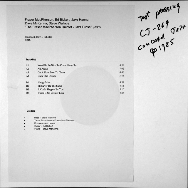 American jazz album is FRASER MAcPHERSON, ED MORE, JAKE HANNA, DAVE McKENNA, STEVE WALLACE-FRASER MacPHERSON QUINTET-1985-TEST PRESSING USA-CONCORD JAZZ number CJ-269