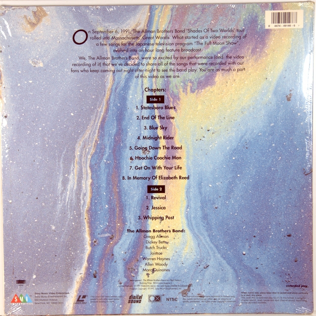Видео лазерный диск группы ALLMAN BROTHERS BAND-LIVE AT GREAT WOODS-1982-USA-SONY MUSIC VIDEO ENTERPRISES-NTSC COLOR A 59 min/B 31 min CLV Stereo номер MLV49146