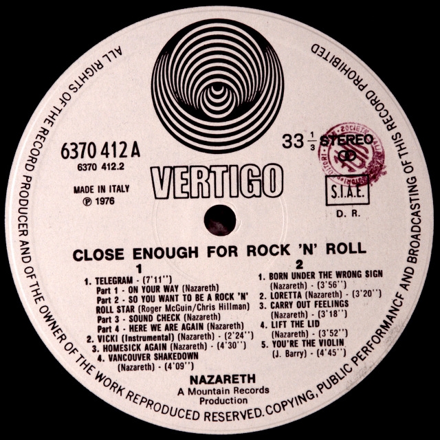 Альбом мечта NAZARETH-CLOSE ENOUGH FOR ROCK'N'ROLL-1976-Первый пресс ITALY-VERTIGO SWIRL номер 6370 412А